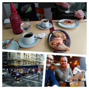 (tom) Irgendwann stellt sich auch mal Appetit bis Hunger ein. Argentinien ist ja dafür bekannt, die Hochburg der „Low-Carb-Bewegung“ zu sein 😀 – im Hinblick auf die überall verfügbaren Fleischangebote – hier werden ganze Rinderhälften gegrillt und verspeist, das Interesse an Beilagen hält sich in Grenzen. Bife de lomo y morcillas. Allerdings gibt es löbliche Ausnahmen. Nicht das verwaiste vegetarische Restaurant in der Caille Montevideo – da verliefen sich gestern Abend ca. drei Gäste, wobei einer vermutlich der Inhaber war 😉 Nein – es gibt sie – die ‚empanandas ricas‘, die mich restlos überzeugt haben. Richtiger Teig aus Weißmehl mit Füllungen jeglicher Art, obwohl man nicht immer genau sagen kann, was es ist. ‚Criolles‘ schmeckt jedenfalls anders als ‚queso y cebolla‘ ! Satt und zufrieden. Und das am ersten Tag. Todo bien!